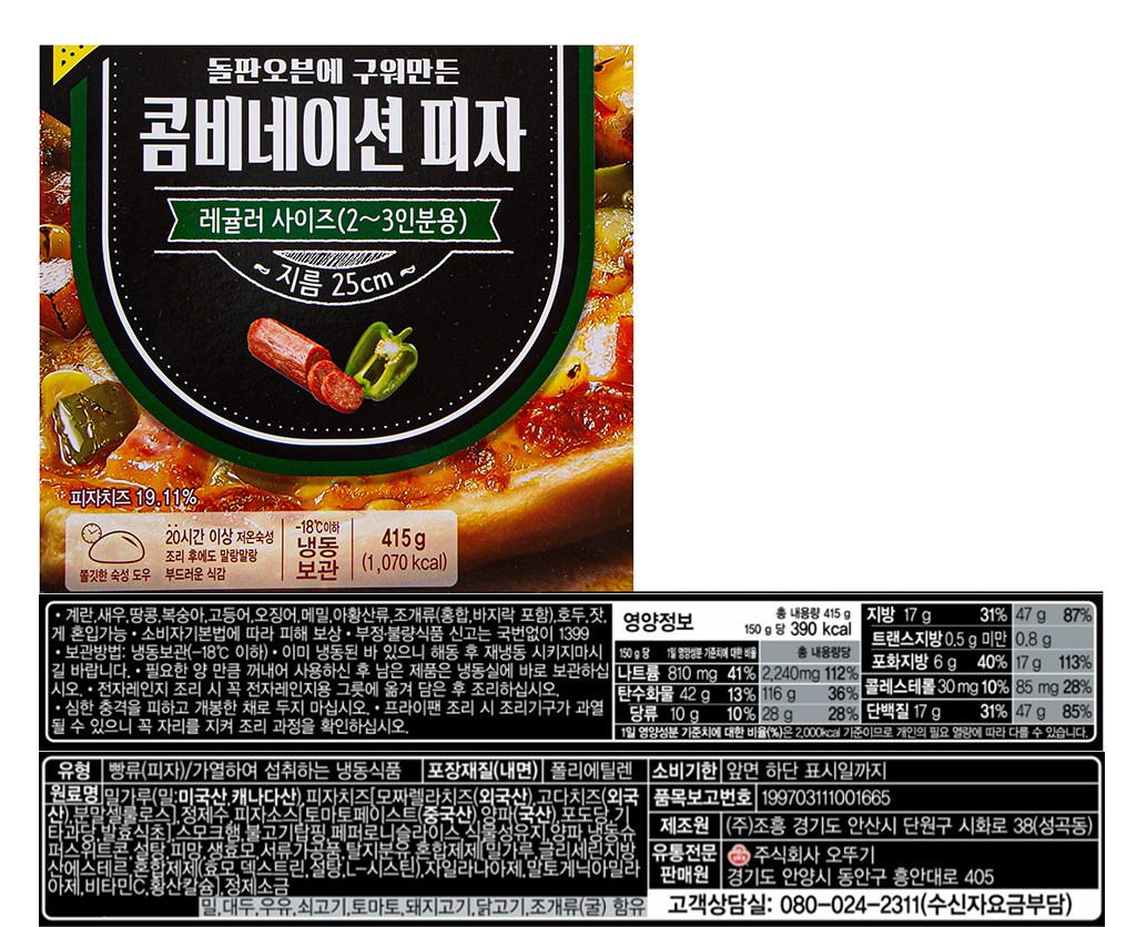 | 제품명 | 오뚜기 콤비네이션 피자 | 식품의 유형 | 컨텐츠 참조 |