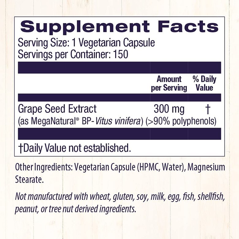 포도씨 추출물이 함유된 식이 보조제입니다. 베지 캡슐 제형이며, 스테아린산 마그네슘이 함유되어 있습니다.