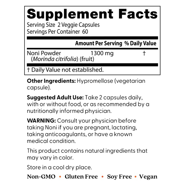 노니 열매 농축물이 함유된 식이 보충제입니다. 케르세틴, 루틴을 함유한 플라보노이드, 쿠머린, 지방산 등 영양소를 함유하고 있습니다. 베지 캡슐 형태로 제공됩니다.