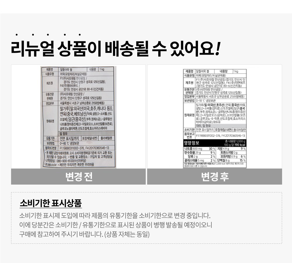 | 생산자 및 소재지 | 컨텐츠 참조 | 소비기한 또는 품질유지기한 | 소비기한(또는 유통기한) : 2026년 01월 28일 이거나 그 이후인 상품 |