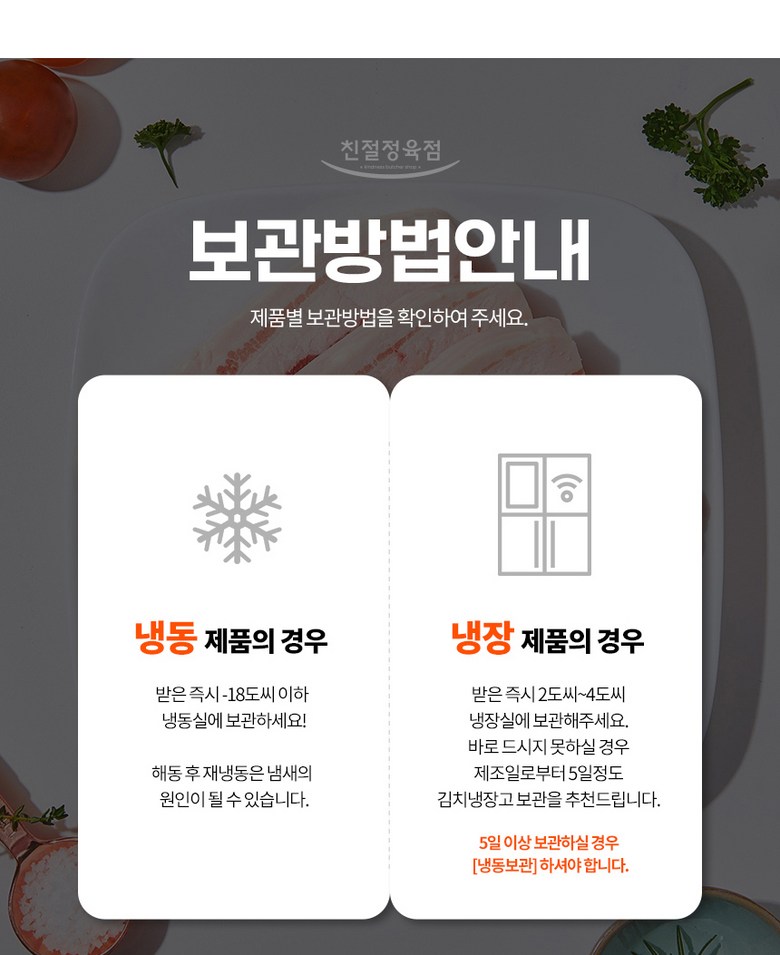 | 배송방법 | 신선/냉장/냉동 | 배송비 | 3,500원 - 70,000원 이상 구매 시 무료배송 - 도서산간 지역 배송불가 |