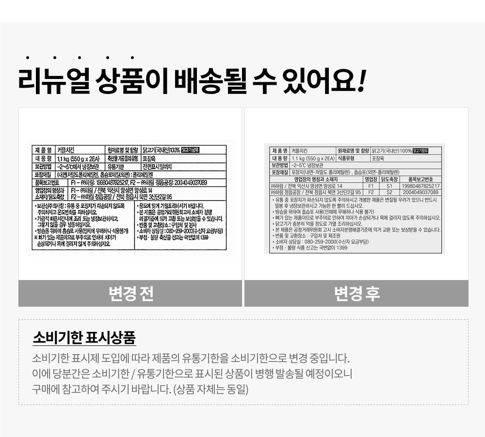 | 제조연월일, 소비기한 또는 품질유지기한 | 소비기한(또는 유통기한) : 2026년 05월 03일 이거나 그 이후인 상품 제조년월일 : 2026년 04월 25일 이후인 제조상품 | 세부 품목군별 표시사항 | 축산물 등급표시 : 해당 없음 / 이력번호 표시유무 : 이력번호 표시제품임 |