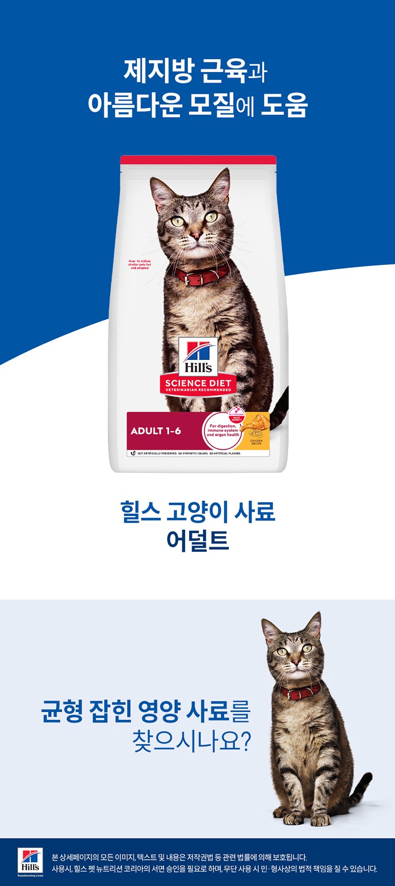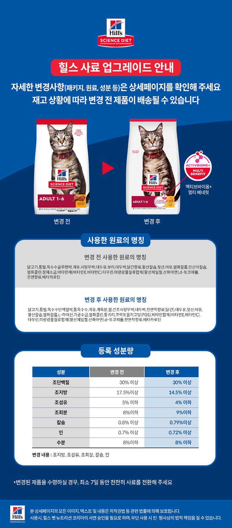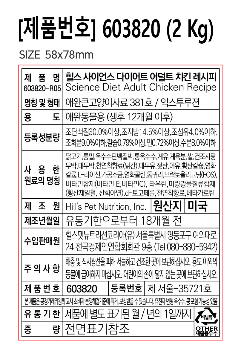 | 품명 및 모델명 | Hill's Science Diet Adult Chicken Recipe Cat Food Dry | 인증/허가 사항 | 사료관리법에 따른 성분등록번호 : 컨텐츠 참조 |