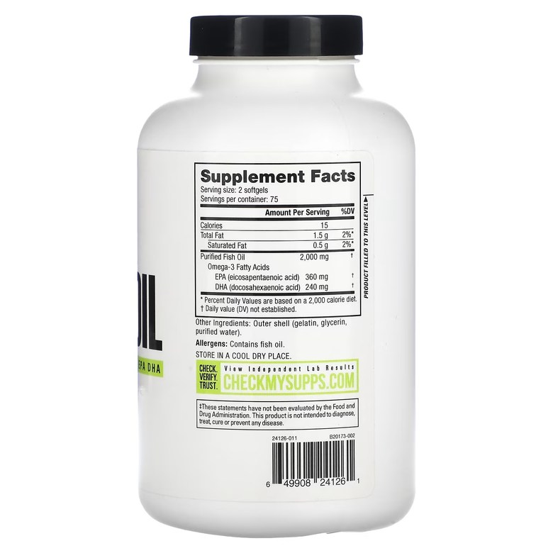 오메가 3 필수 지방산이 함유된 식이 보충제입니다. 1회 제공량 당 2000mg의 생선 오일을 제공하며, 344mg의 EPA와 230mg의 DHA를 함유하고 있습니다. 섭취 및 흡수가 용이한 소프트젤 형태로 제공됩니다.