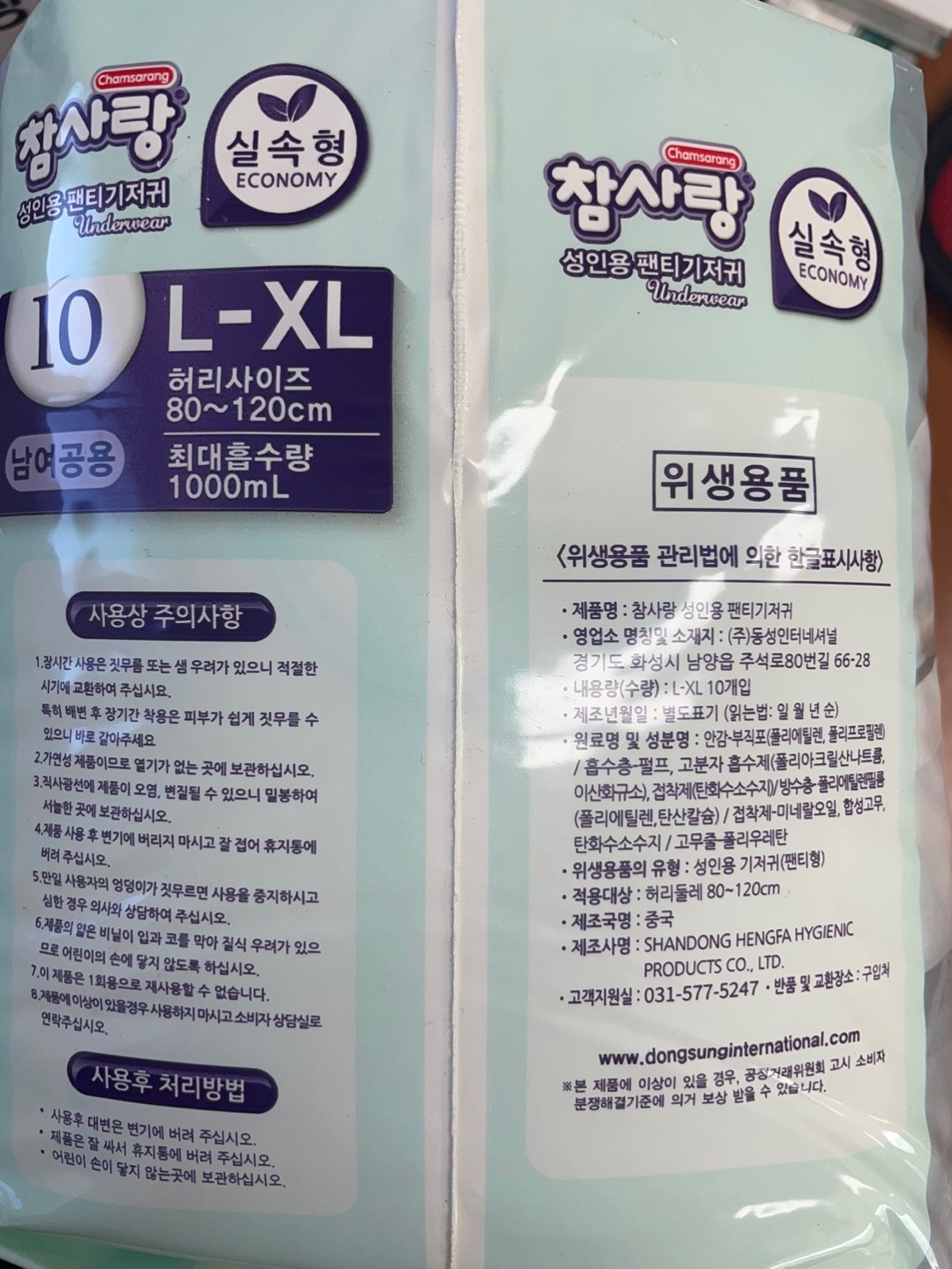 | 품명 및 모델명 | 참사랑 성인용 팬티기저귀 | 인증/허가 사항 | 위생용품 |