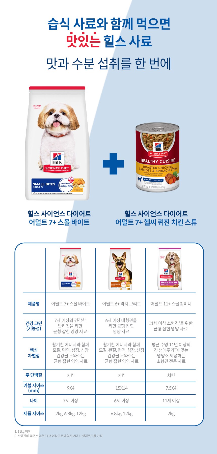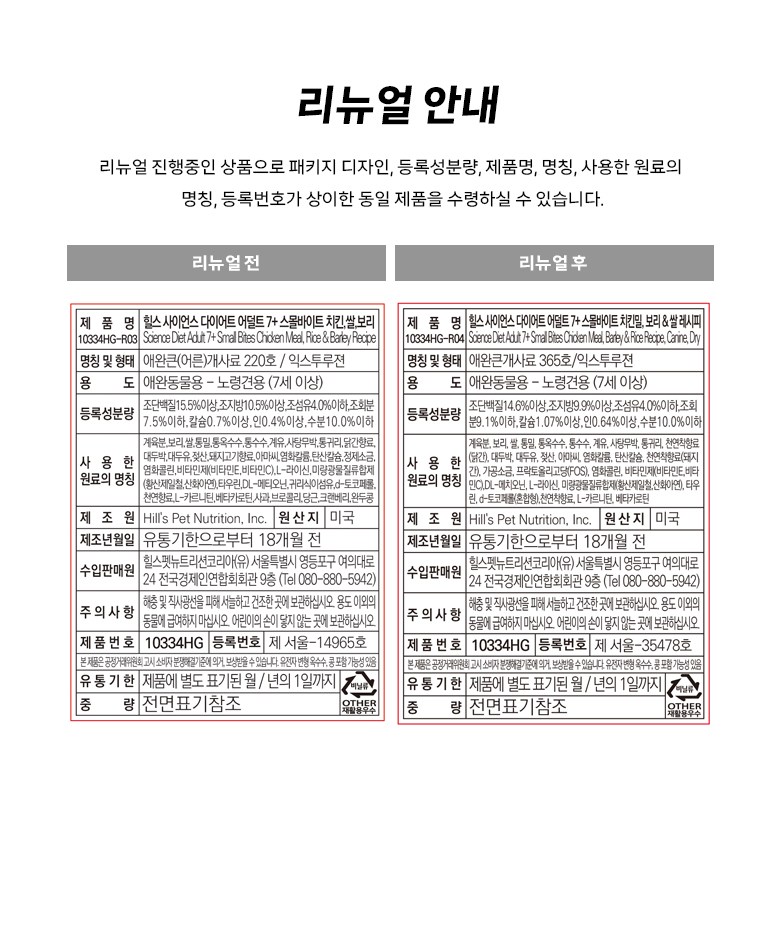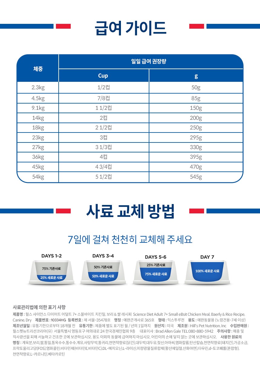 | 품명 및 모델명 | 리뉴얼전:힐스 사이언스 다이어트 어덜트 7+ 스몰바이트 치킨, 쌀, 보리/ 리뉴얼후:힐스 사이언스 다이어트 어덜트 7+ 스몰바이트 치킨밀, 보리 & 쌀 레시피 | 인증/허가 사항 | 사료관리법에 따른 성분등록번호 : 컨텐츠 참조 |