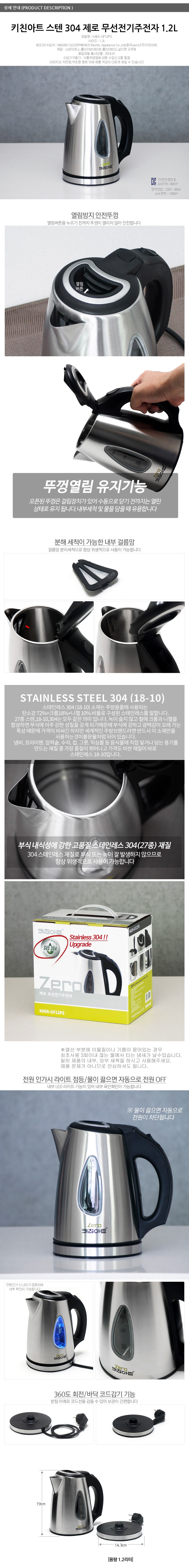 | 품명 및 모델명 | 키친아트 제로 스텐1.2리터 / KAEK-GF12PS | 재질 | 스테인레스, 폴리카보네이트, 플리아미드, 실리콘 고무재 |