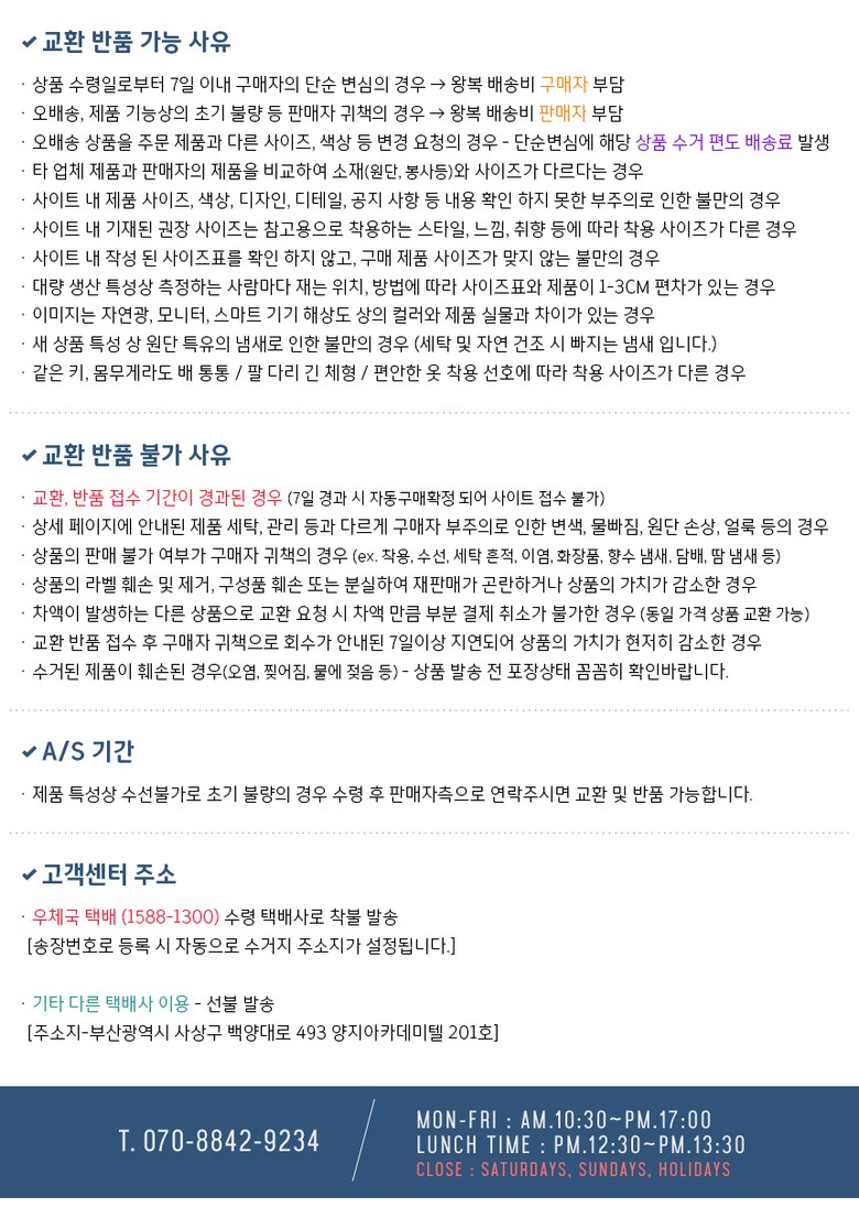 - ㆍ모니터 해상도의 차이로 인해 색상이나 이미지가 실제와 달라, 고객이 단순 변심으로 교환/반품을 무료로 요청하는 경우