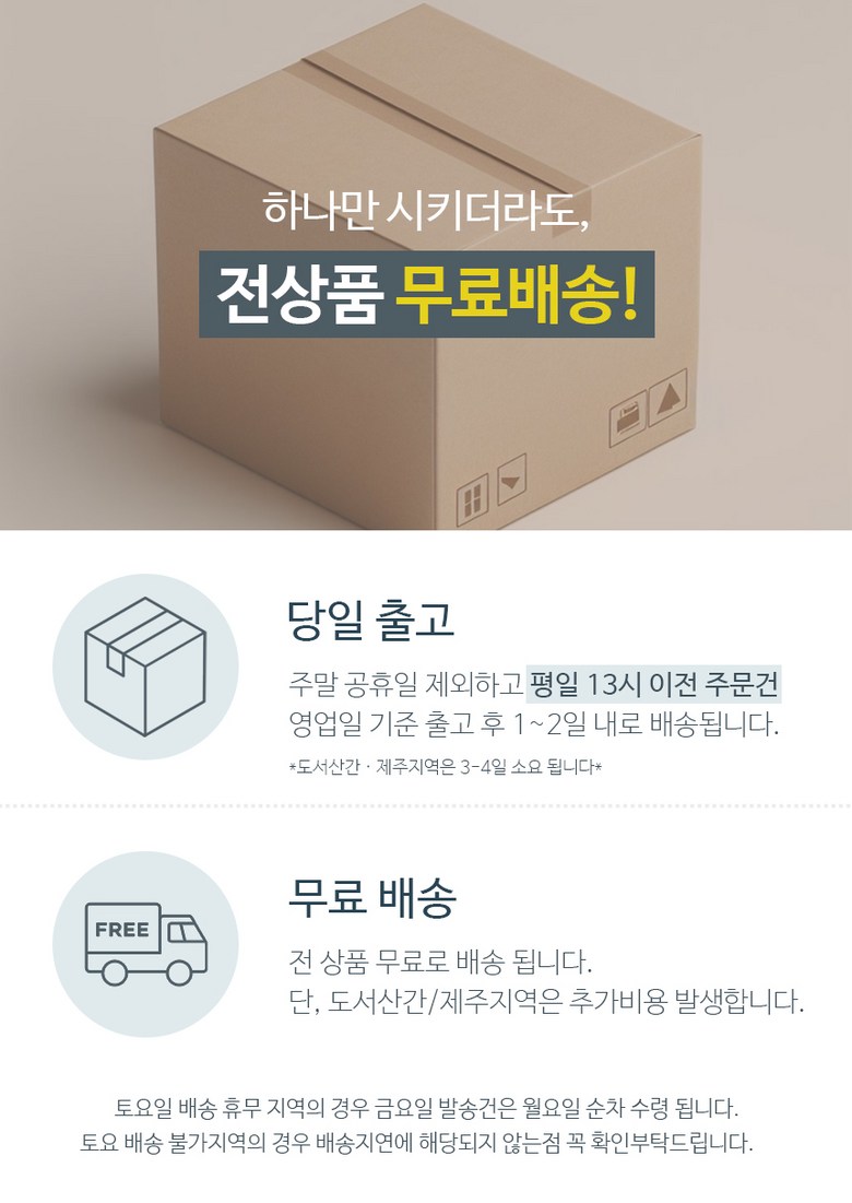 | 배송방법 | 순차배송 | 배송비 | 무료배송 · 도서산간 추가 배송비 - 제주 지역: 400원 - 도서산간 지역: 400원 |
