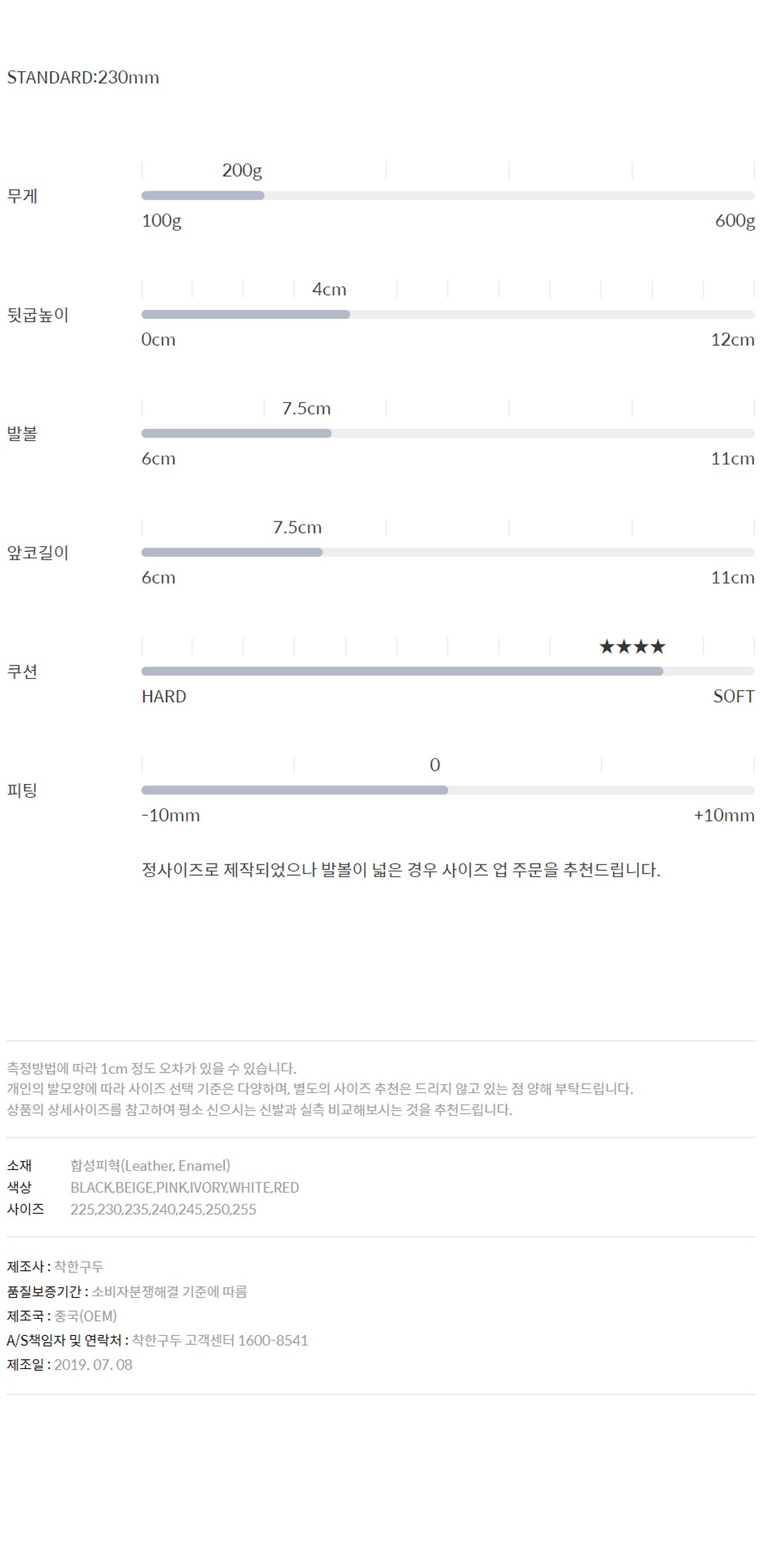 | 치수 | 컨텐츠 참조 | 제조자(수입자) | 착한구두 |