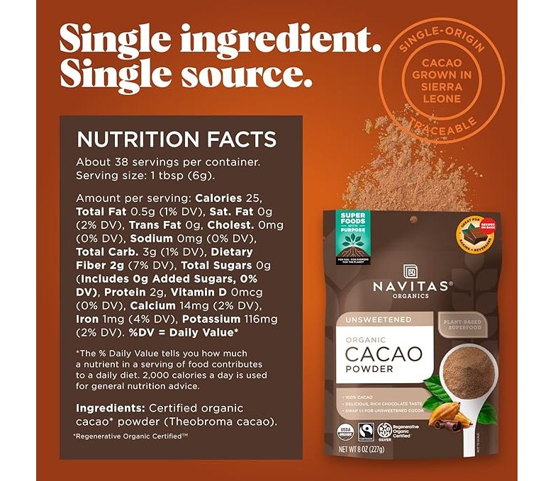 볶지 않고 냉간압연하여 만든 고품질 카카오 파우더입니다. 마그네슘, 철분, 섬유소, 항산화 성분을 제공합니다. 풍부하고 깊은 초콜릿 맛을 즐길 수 있습니다. 스무디, 셰이크, 오트밀, 핫 초콜릿, 브라우니 등의 맛을 증진시켜 줍니다.
