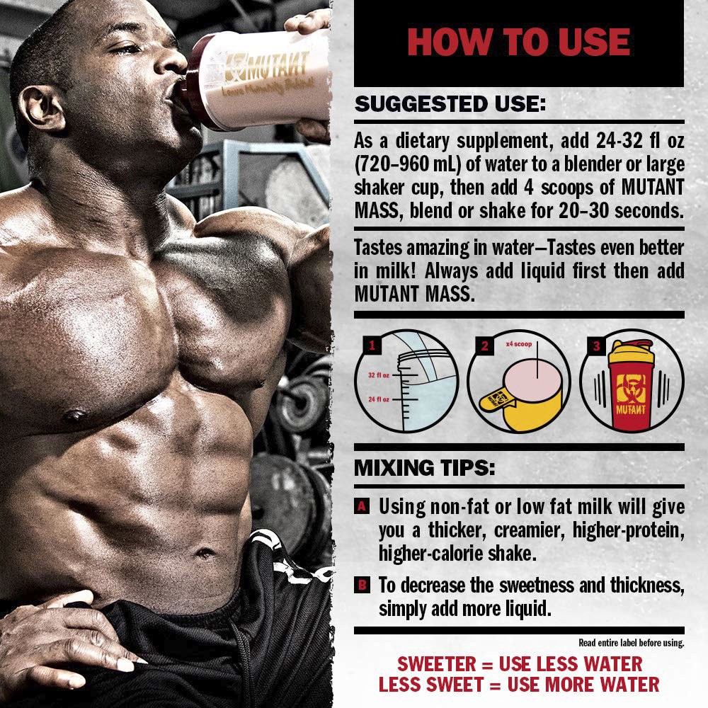 식이 보충제로, 720-960ml의 물을 블렌더나 셰이커 컵에 넣고 4스쿱의 Mutant Mass를 넣어 주세요. 20-30초간 잘 섞어주세요.