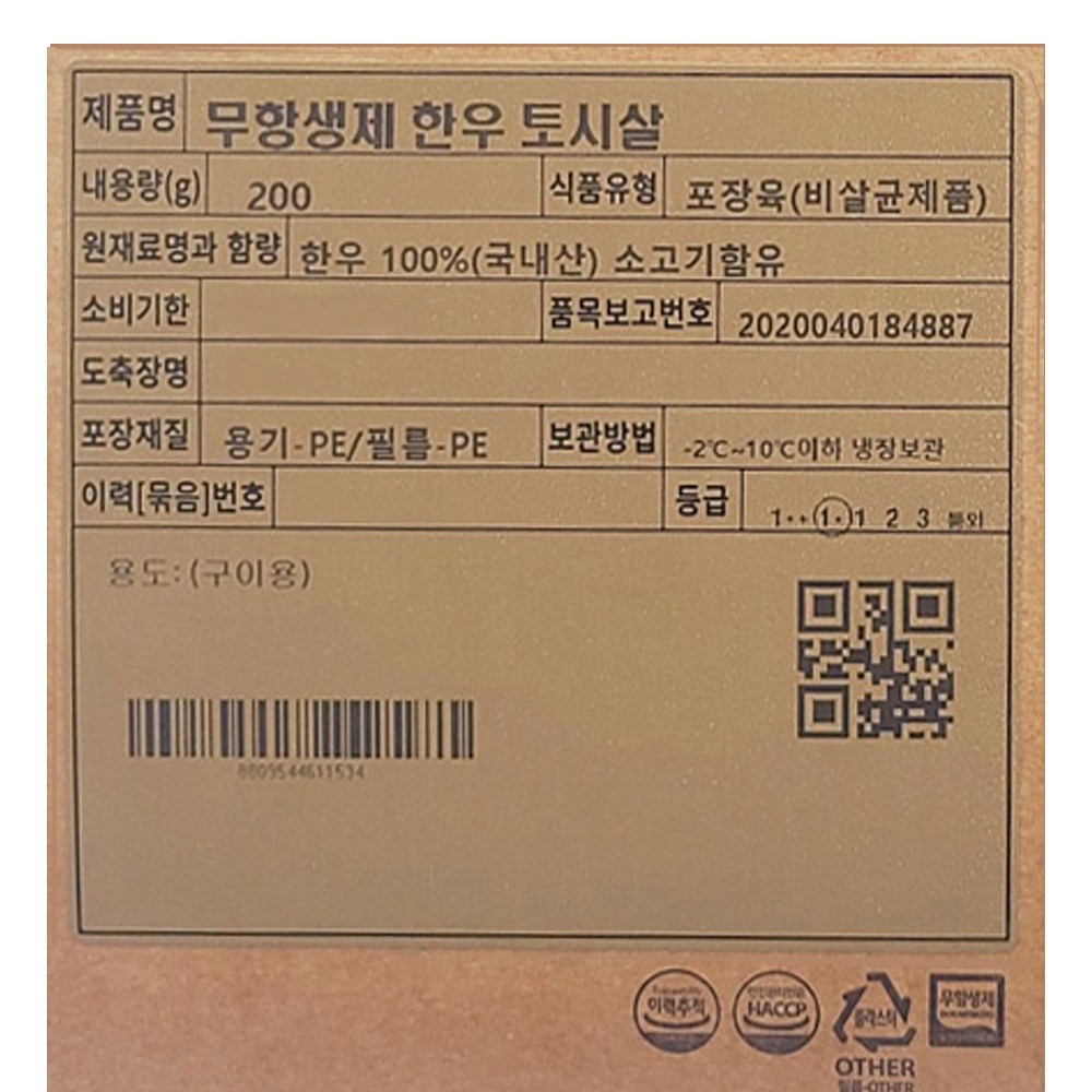 | 소비기한 또는 품질유지기한 | 소비기한(또는 유통기한) : 2026년 05월 02일 이거나 그 이후인 상품 | 세부 품목군별 표시사항 | 축산물 등급표시 : 1+등급 / 이력번호 표시유무 : 이력번호 표시제품임 |