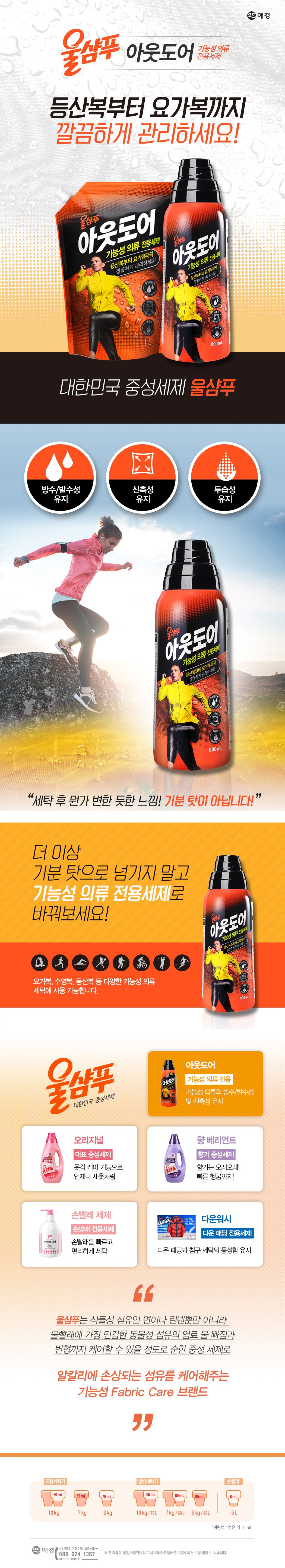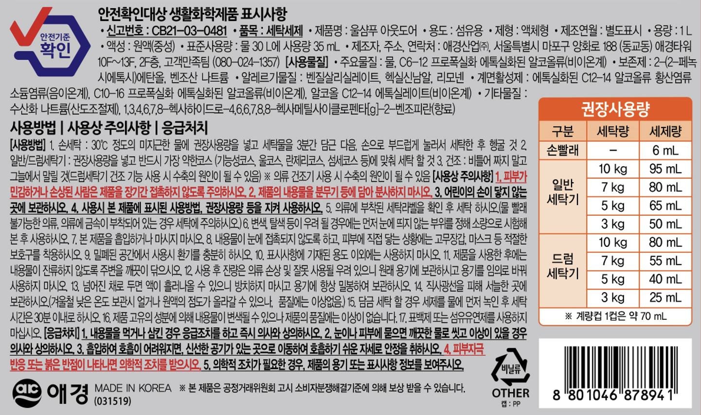 | 품목 및 제품명 | 세탁세제 / 울샴푸 아웃도어 | 용도(표백제의 경우 계열을 함께표시) 및 제형 | 섬유용 / 비분사형-액체형 |