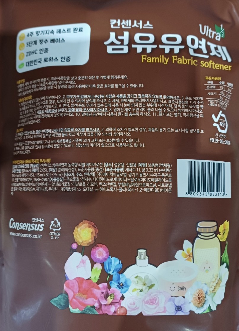 | 품목 및 제품명 | 섬유유연제/ 컨센서스 섬유유연제 농축형 리필 베이비로션 | 용도(표백제의 경우 계열을 함께표시) 및 제형 | 섬유용, 신발용/ 보충형(액체형) |