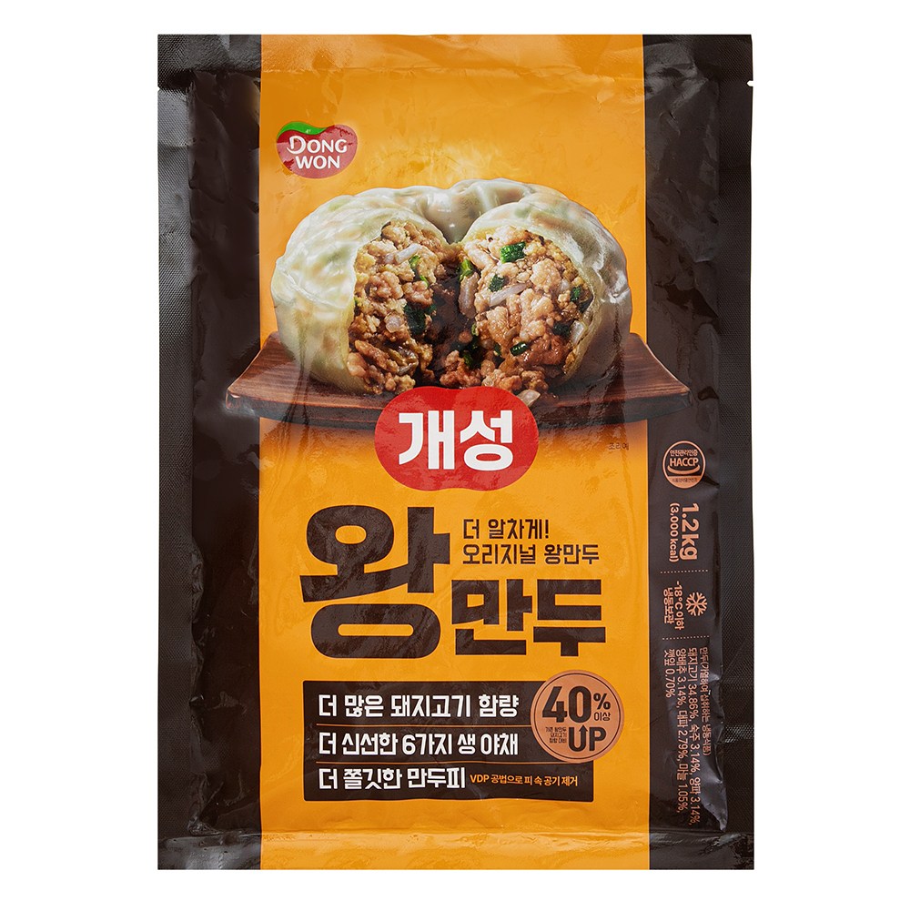 큼직한 크기를 자랑하는 개성 왕만두예요. 이북식 만두 특유의 담백한 맛이 돋보이는데요. 반숙 속 공기를 제거하는 VDP 공법으로 쫄깃쫄깃하게 만든 만두피도 매력적이랍니다. 구수한 육즙이 가득한 돼지고기부터 두부, 숙주, 깻잎 등이 알차게 들어있으니 감칠맛을 즐겨보세요.