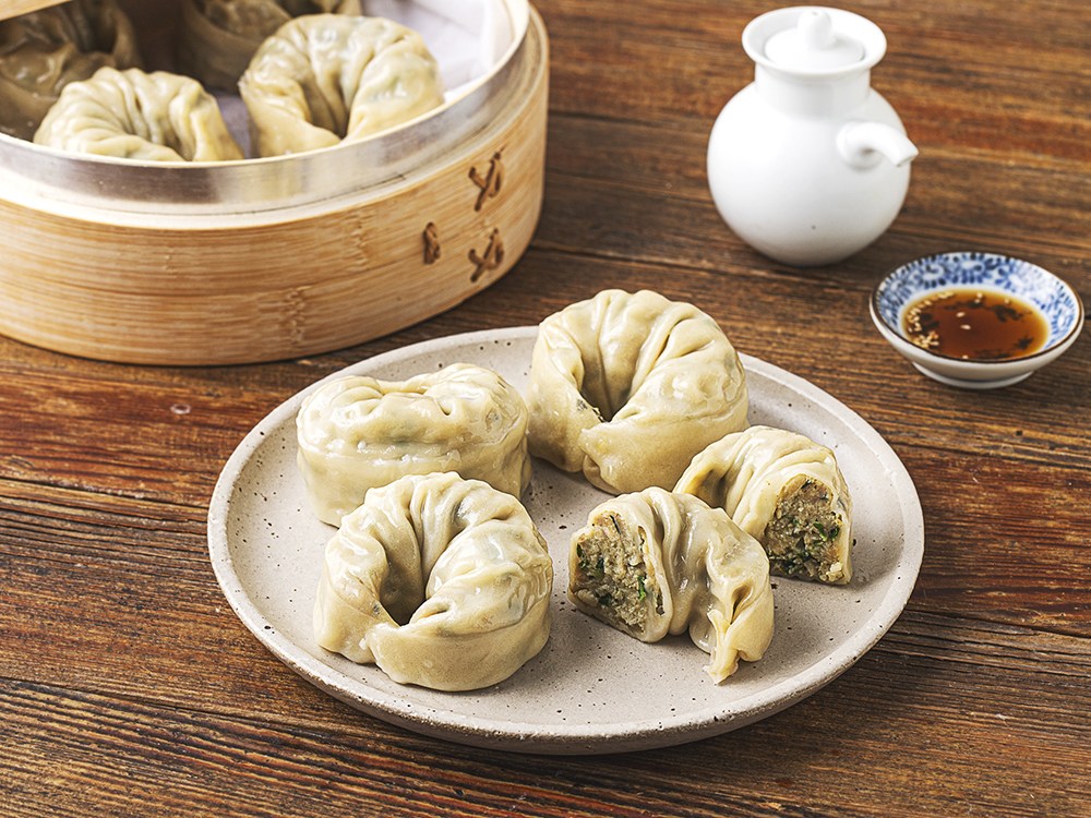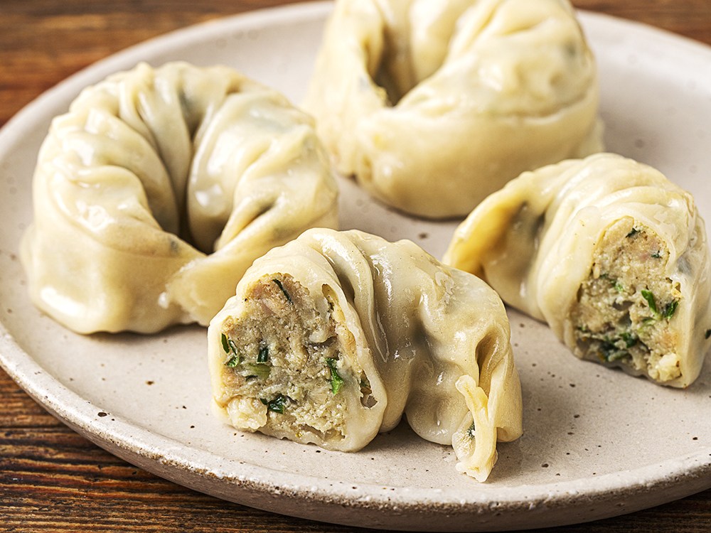 큼직하게 빚은 개성식 왕만두예요. VDP 공법으로 반죽 속 공기를 제거해, 쫄깃쫄깃한 만두피를 완성했답니다. 돼지고기, 부추, 숙주 등 다채로운 재료를 채워 넣어 풍성한 식감을 자랑하죠. 한 입 베어 물면 담백하고 고소한 육즙이 입안 가득 느껴져요.