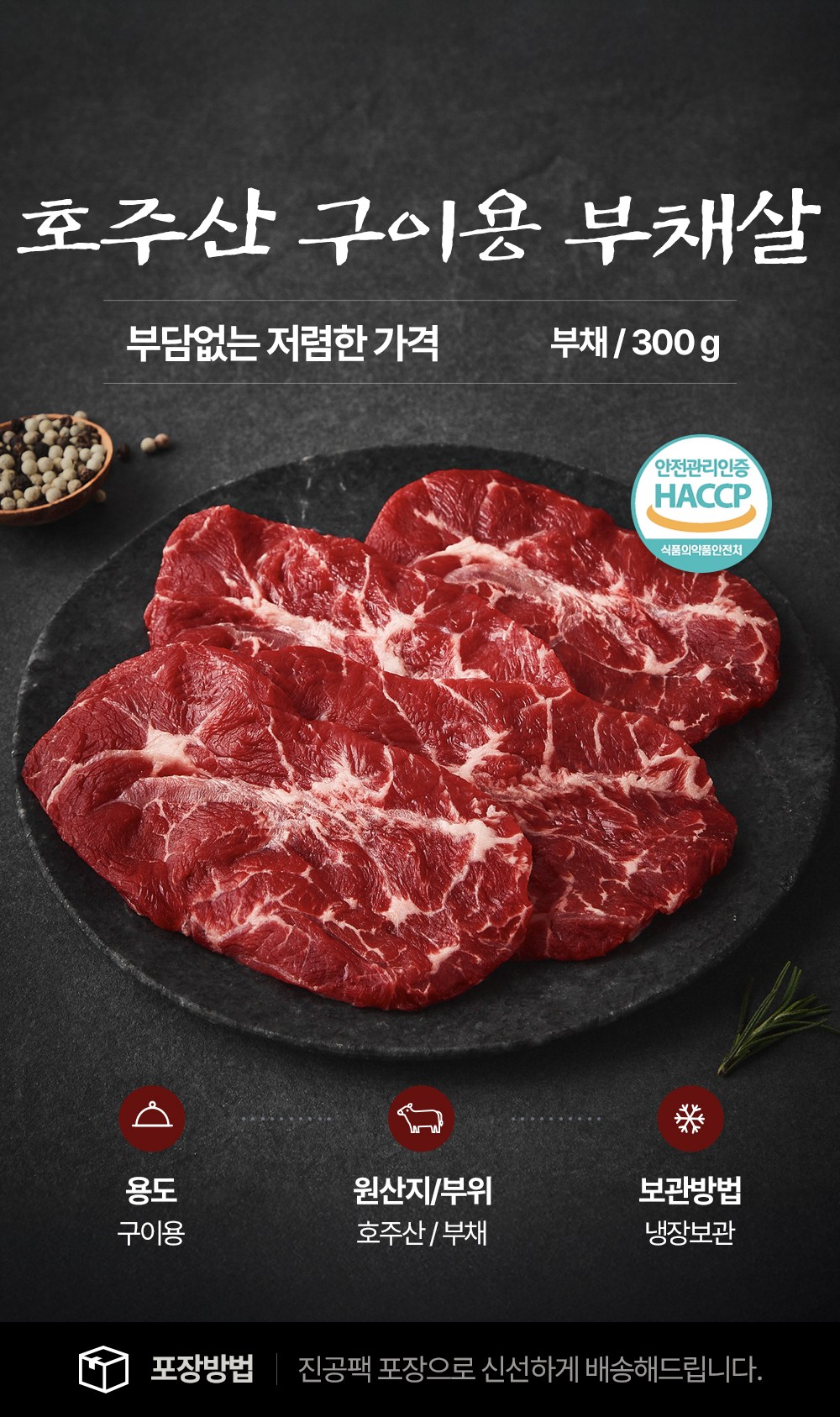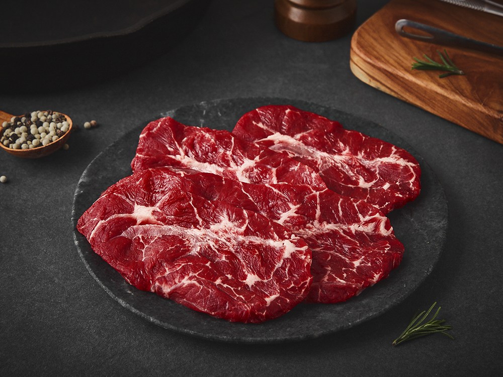 선명한 마블링과 그윽한 육향을 가진 부위, 부채살이에요. 육즙이 풍부해 별다른 양념 없이 구워도 맛있답니다. 선호하는 굽기로 조리해 고소한 감칠맛을 만끽해보세요. 와인 한 잔을 곁들이면 더욱 근사한 식사가 될 거예요.