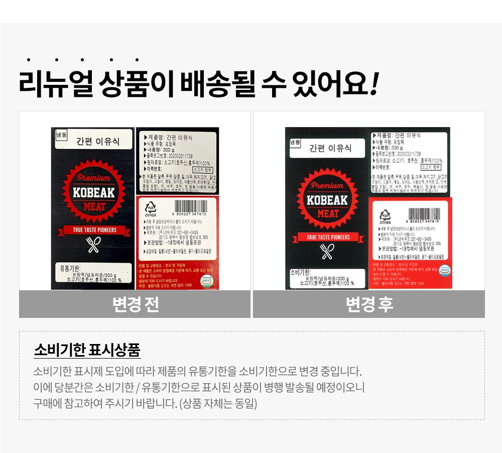 | 제조연월일, 소비기한 또는 품질유지기한 | 소비기한(또는 유통기한) : 2026년 11월 10일 이거나 그 이후인 상품<br />제조년월일 : 2025년 11월 11일 이후인 제조상품 | 세부 품목군별 표시사항 | 축산물 등급표시 - 해당없음 / 이력번호 표시유무 - 이력번호 표시제품임 |