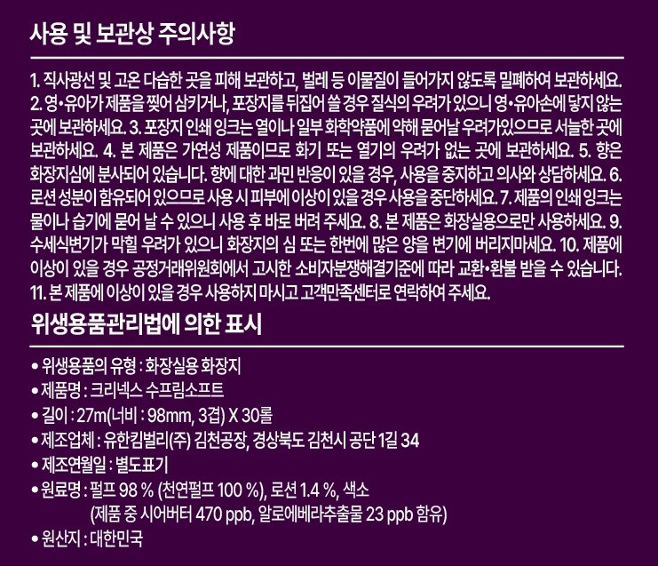 | 품명 및 모델명 | 크리넥스 수프림소프트 | 인증/허가 사항 | 위생용품 |
