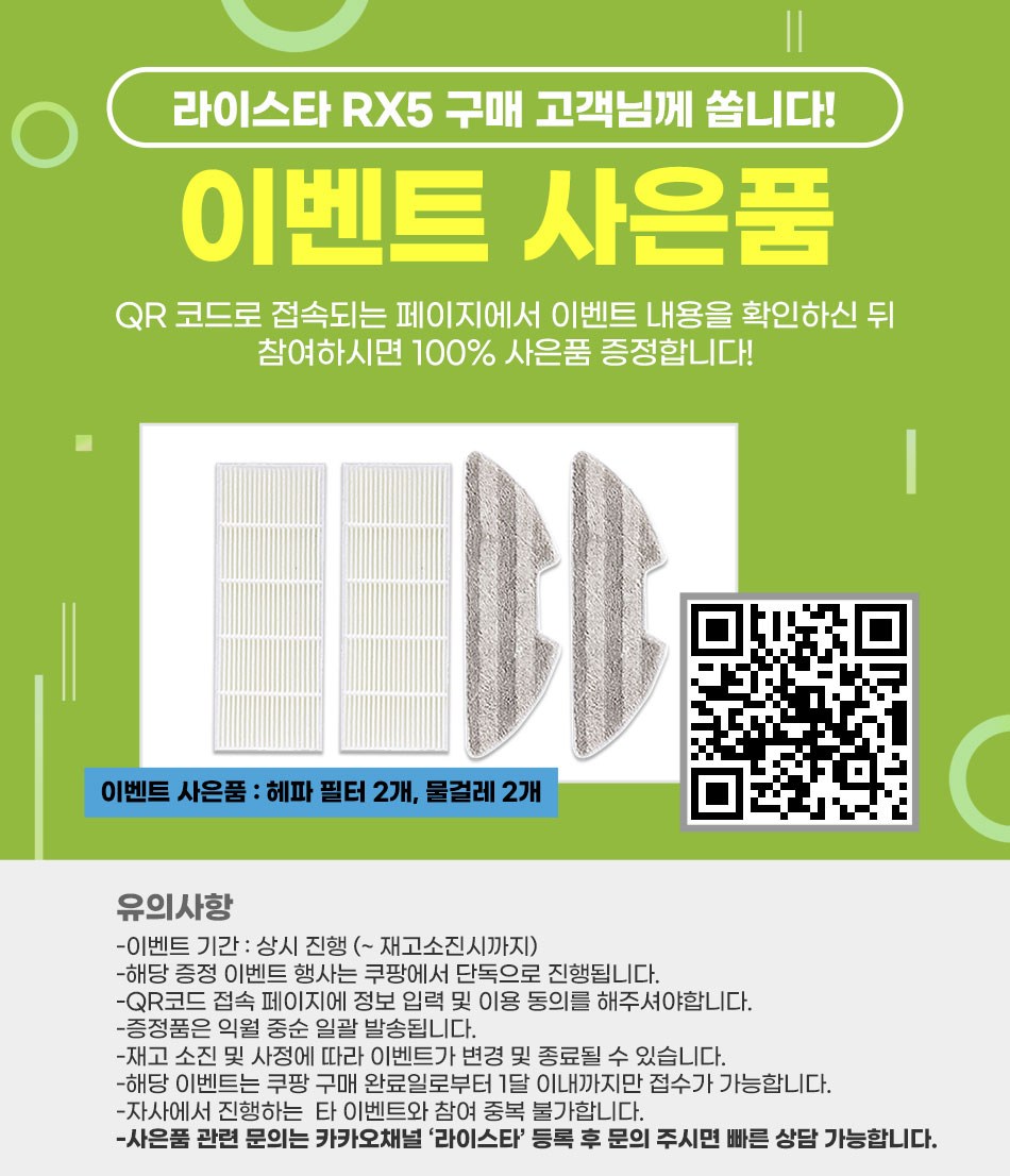 | 품명 및 모델명 | 라이스타 로봇청소기 RX5 | KC 인증정보 | 본품 : R-R-DwI-LISTARRX5 / 어댑터 : HU10590-18011A / 배터리 : XU101323-18002A |