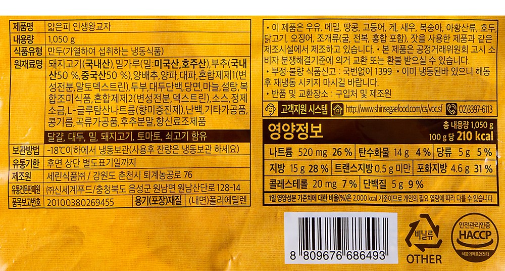| 제품명 | 얇은피 인생 왕교자 | 식품의 유형 | 만두(가열하여 섭취하는 냉동식품) |