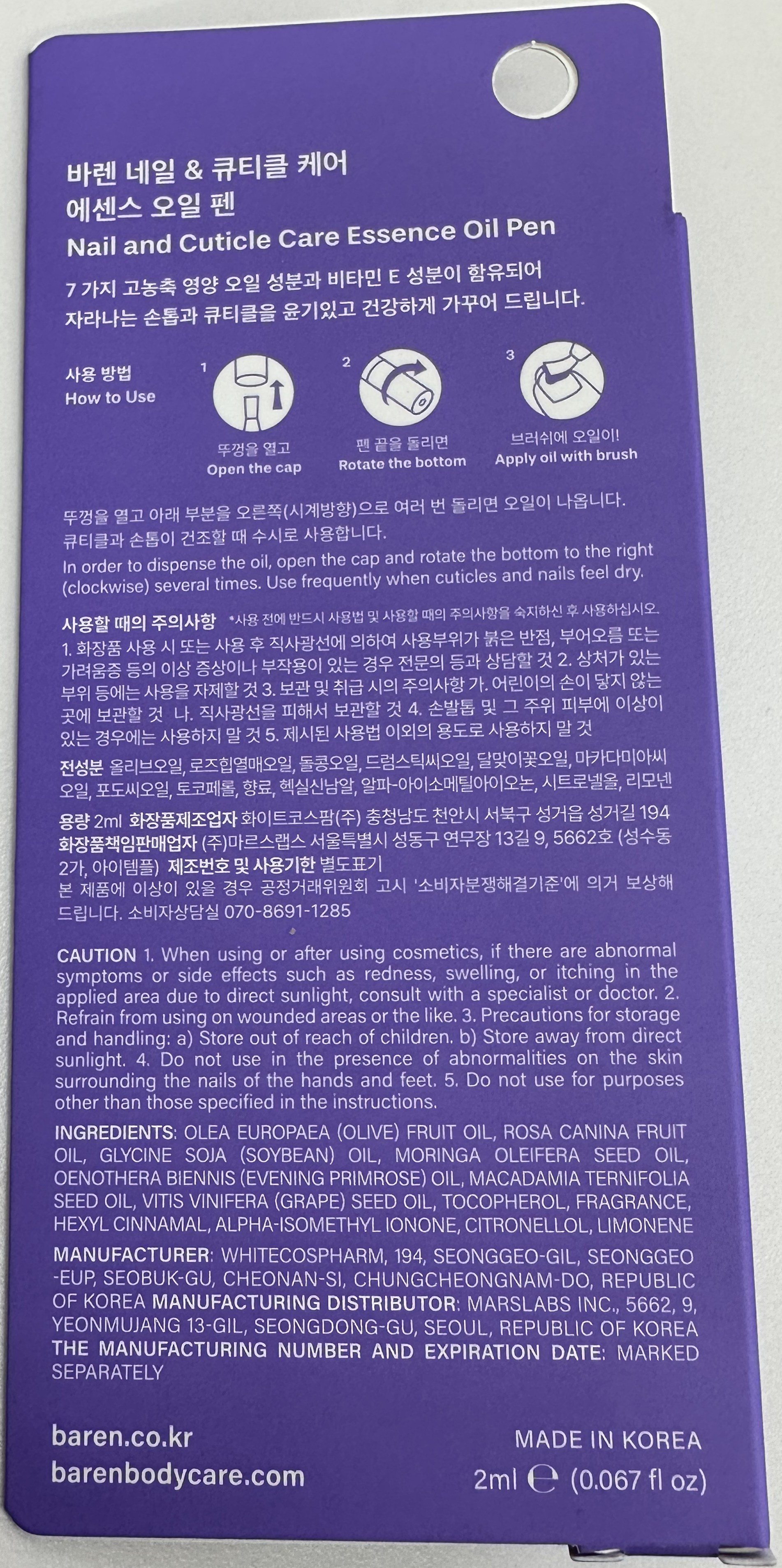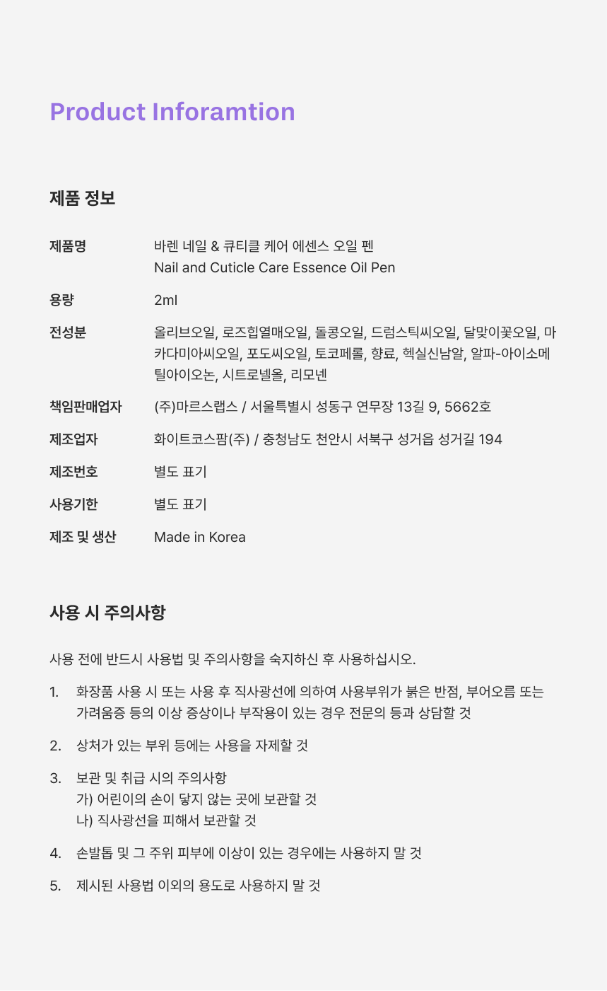 | 화장품제조업자, 화장품책임판매업자 및 맞춤형화장품판매업자 | 컨텐츠 참조 | 제조국 | 대한민국 |