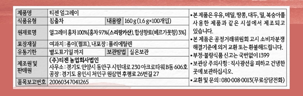 | 제품명 | 티젠 얼그레이 | 식품의 유형 | 침출차 |