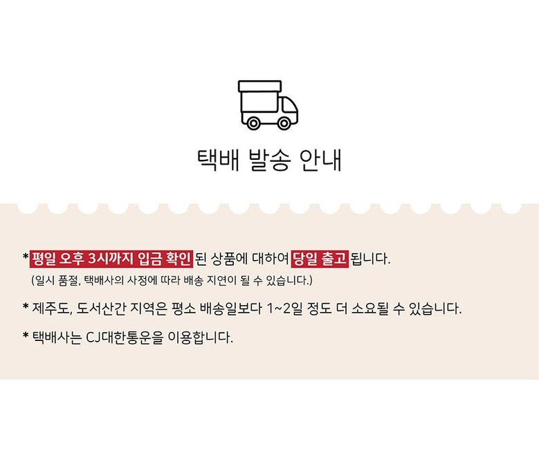 | 배송기간 | ㆍ도서산간 지역 등은 배송에 3-5일이 더 소요될 수 있습니다. - 천재지변, 물량 수급 변동 등 예외적인 사유 발생 시, 다소 지연될 수 있는 점 양해 부탁드립니다. | ||