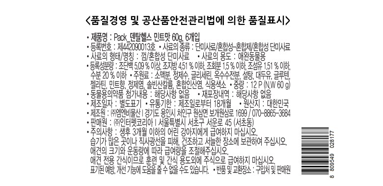 | 품명 및 모델명 | 덴탈헬스 민트맛 60g | 인증사항 | 해당없음 |