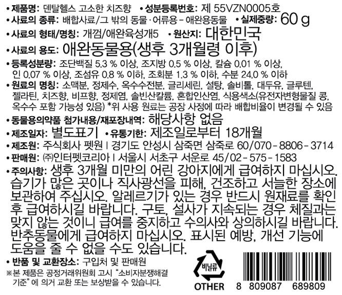 | 품명 및 모델명 | 덴탈헬스 치즈맛 60g | 인증사항 | 해당없음 |
