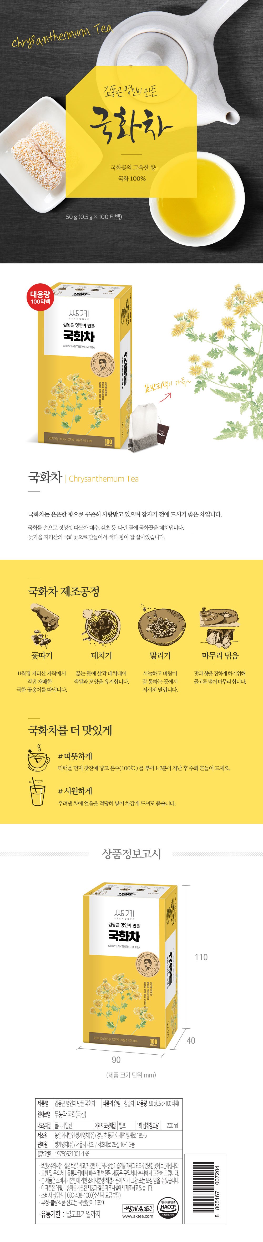 | 제품명 | 김동곤 명인이 만든 국화차 | 식품의 유형 | 컨텐츠 참조 |