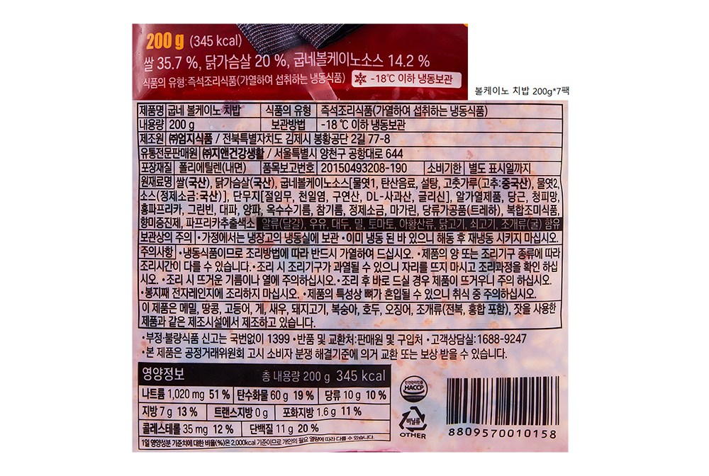 | 포장단위별 내용물의 용량(중량), 수량 | 200g x 7개 | 원재료명 및 함량 | 컨텐츠 참조 |