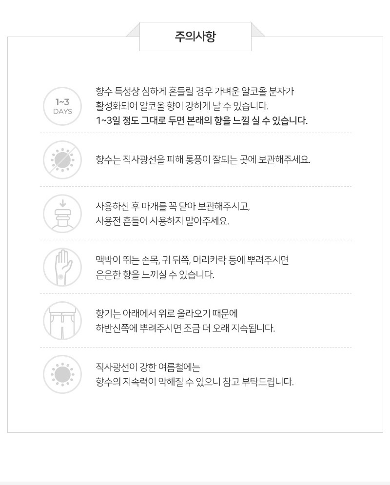| 사용기한 또는 개봉 후 사용기간 | 본 상품은 해당 물류센터 직발송 상품인 관계로 제조연월일 및 유통기한 정보가 매번 변경되므로 상단 유통기한 정보를 참고해 주세요. | 사용방법 | 손목,귀뒤 등 맥박이 뛰는 부위에 뿌려주세요 |