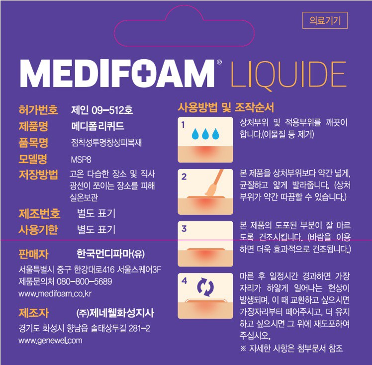 | 품명 및 모델명 | 점착성투명창상피복재 MSP8 | 허가∙인증∙신고번호 (의료기기법에 따른 허가∙인증∙신고 대상 의료기기에 한함) | 허가/신고번호 : 제인 09-512호 |