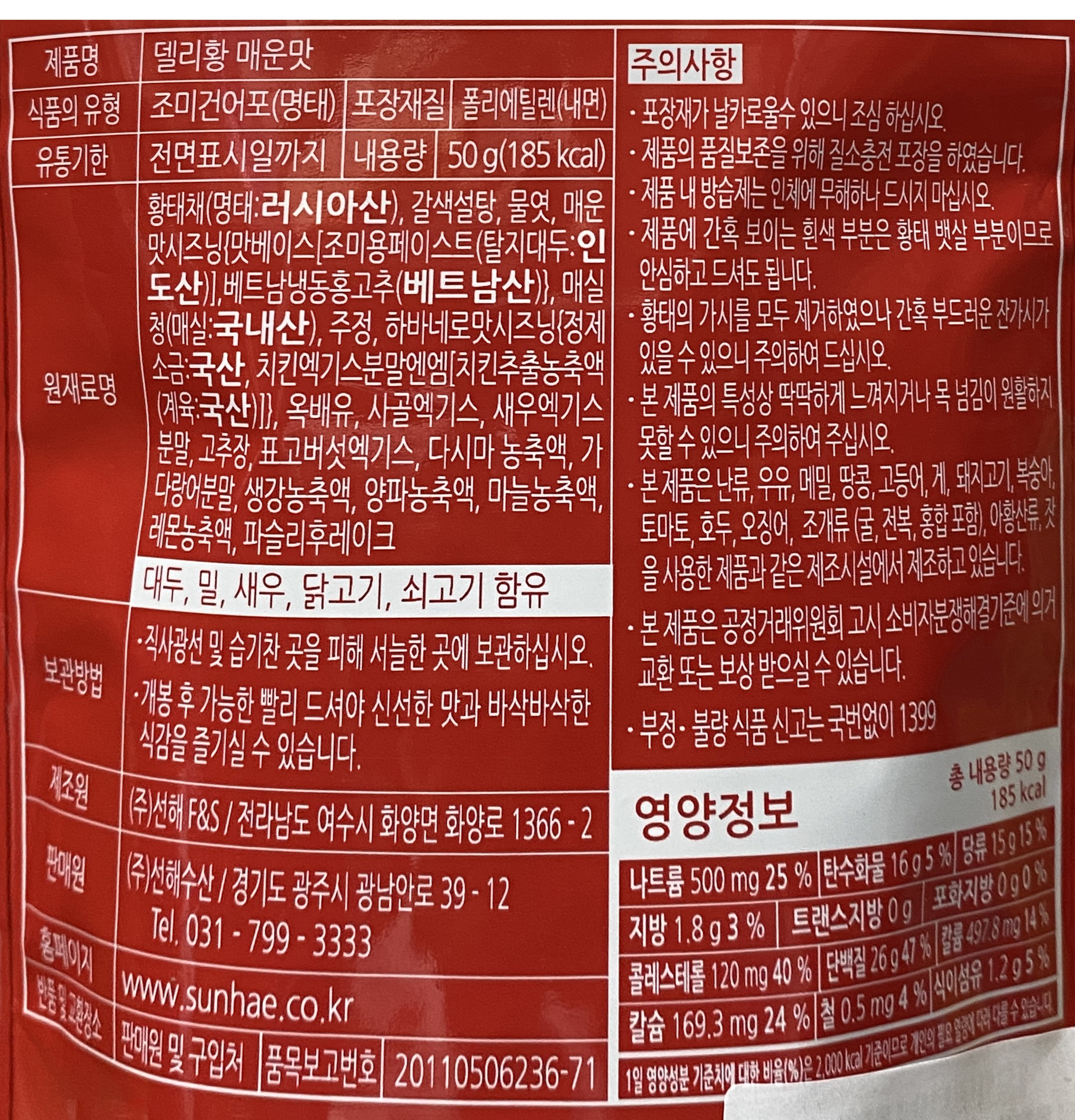 | 제품명 | 델리황 매운맛 | 식품의 유형 | 조미건어포류(명태) |