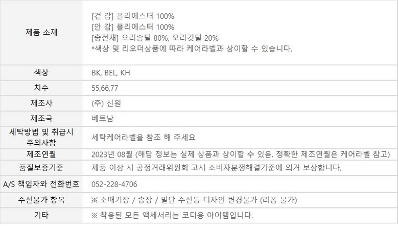 | 제조국 | 상품 상세페이지 참조 | 세탁방법 및 취급시 주의사항 | 상품 상세페이지 참조 |