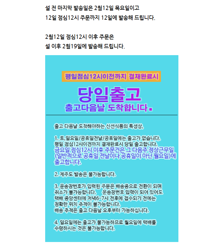 | 배송방법 | 신선/냉장/냉동 | 배송비 | 무료배송 - 도서산간 지역 배송불가 |