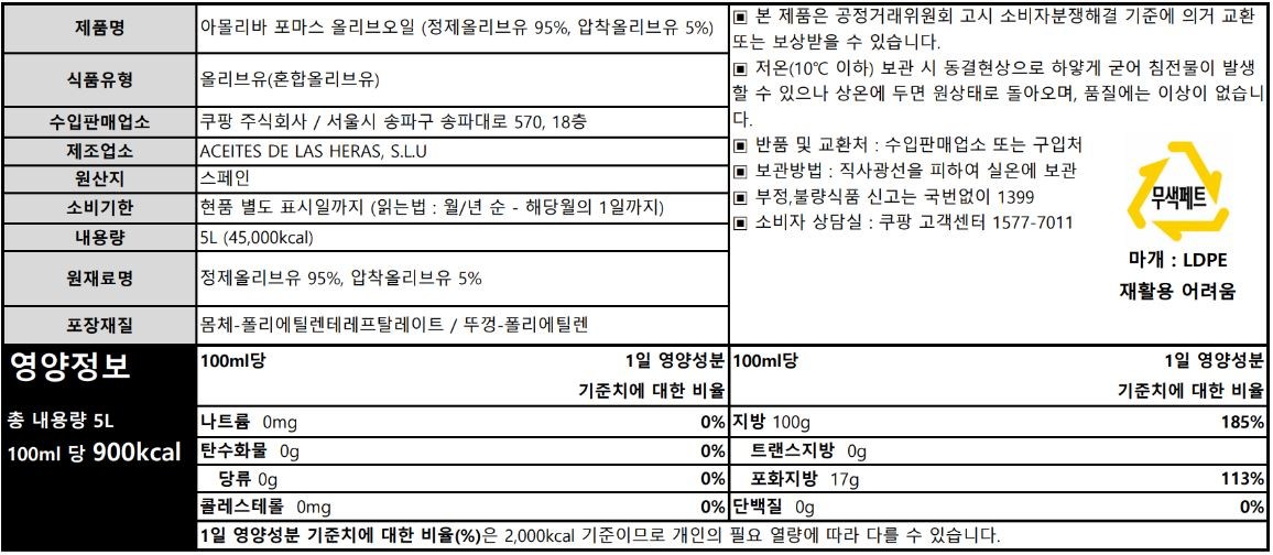 | 포장단위별 내용물의 용량(중량), 수량 | 5L x 1개 | 원재료명 및 함량 | 컨텐츠 참조 |