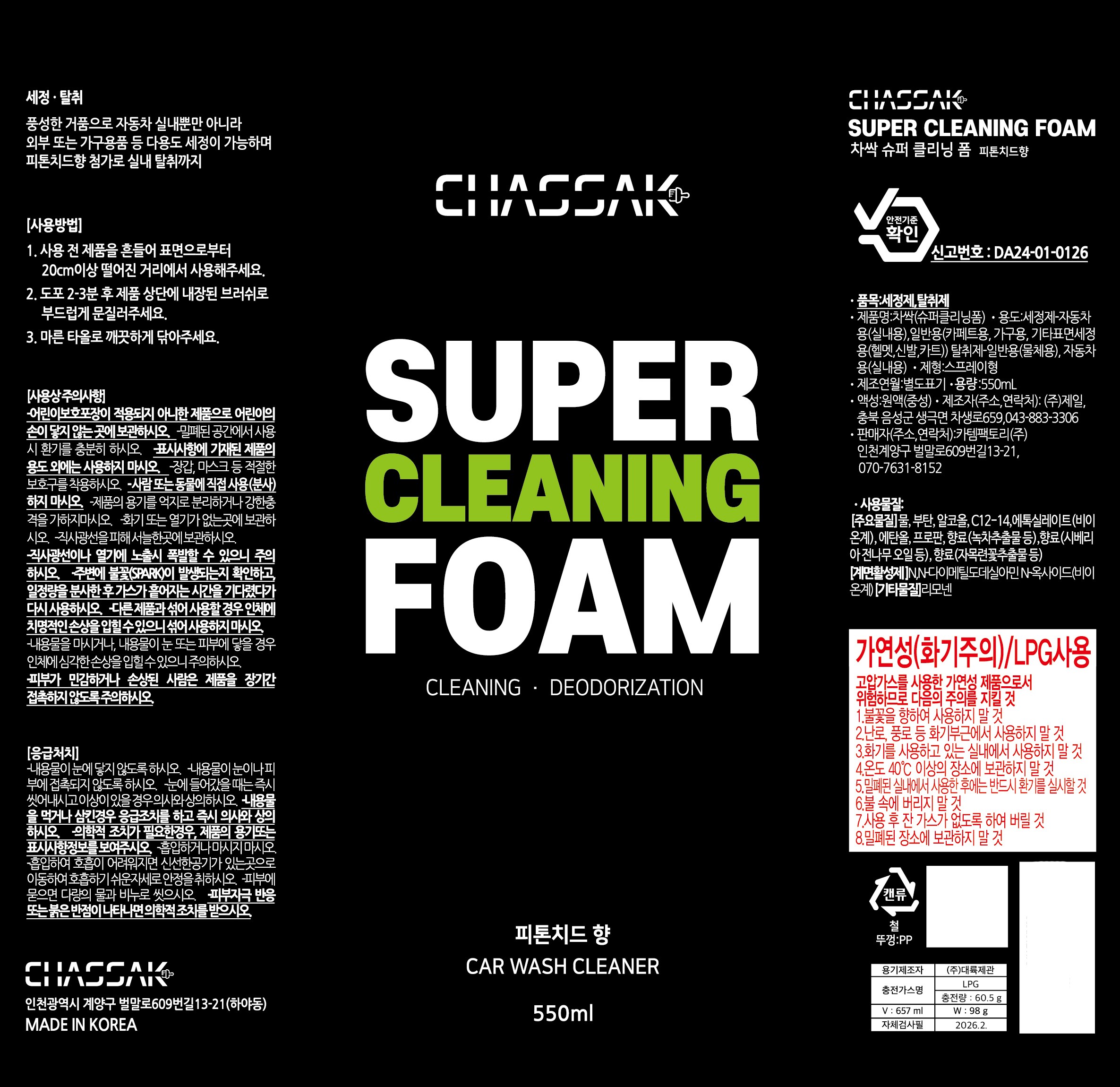 | 품목 및 제품명 | 세정제,탈취제/차싹(슈퍼클리닝폼) | 용도(표백제의 경우 계열을 함께표시) 및 제형 | 세정제-자동차용(실내용),일반용(카페트용,가구용,기타표면세정용(헬멧,신발,카트)) 탈취제-자동차용(실내용),일반용(물체용)/스프레이형 |