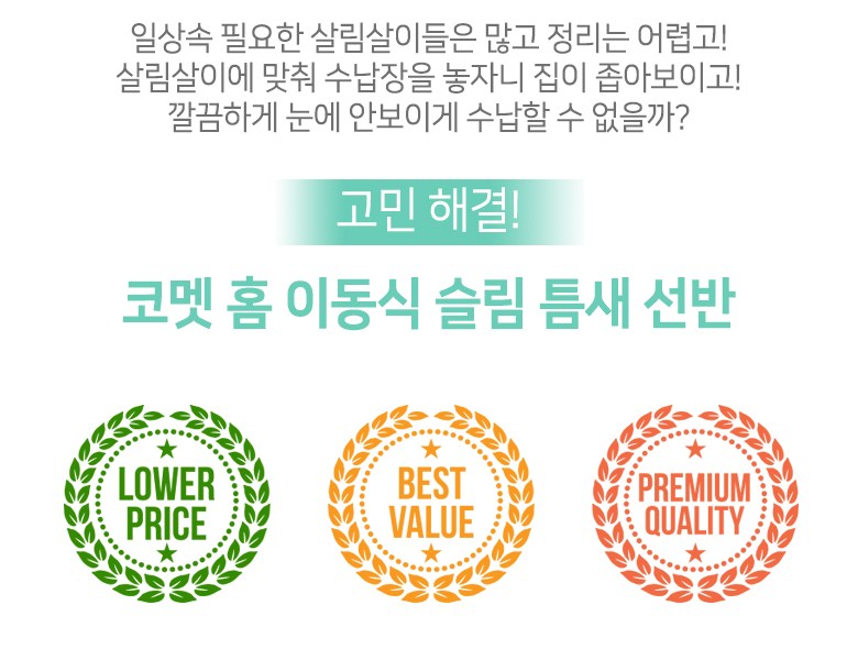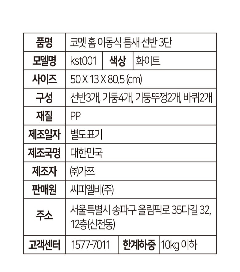 | 품명 및 모델명 | 코멧 3단 이동식 틈새 선반 | 인증/허가 사항 | 해당없음 |