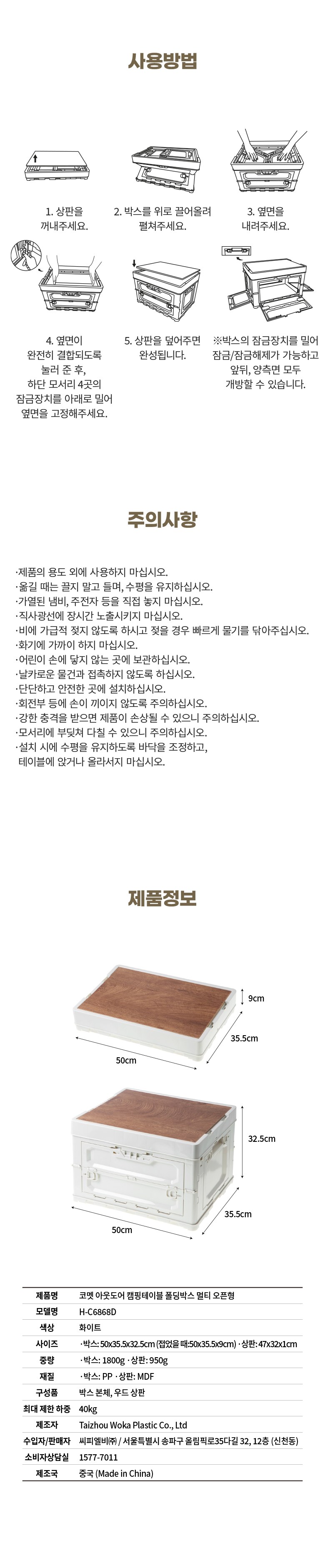 | 품명 및 모델명 | 코멧 아웃도어 캠핑테이블 폴딩박스 멀티 오픈형, 화이트 | KC 인증정보 | 해당없음 |