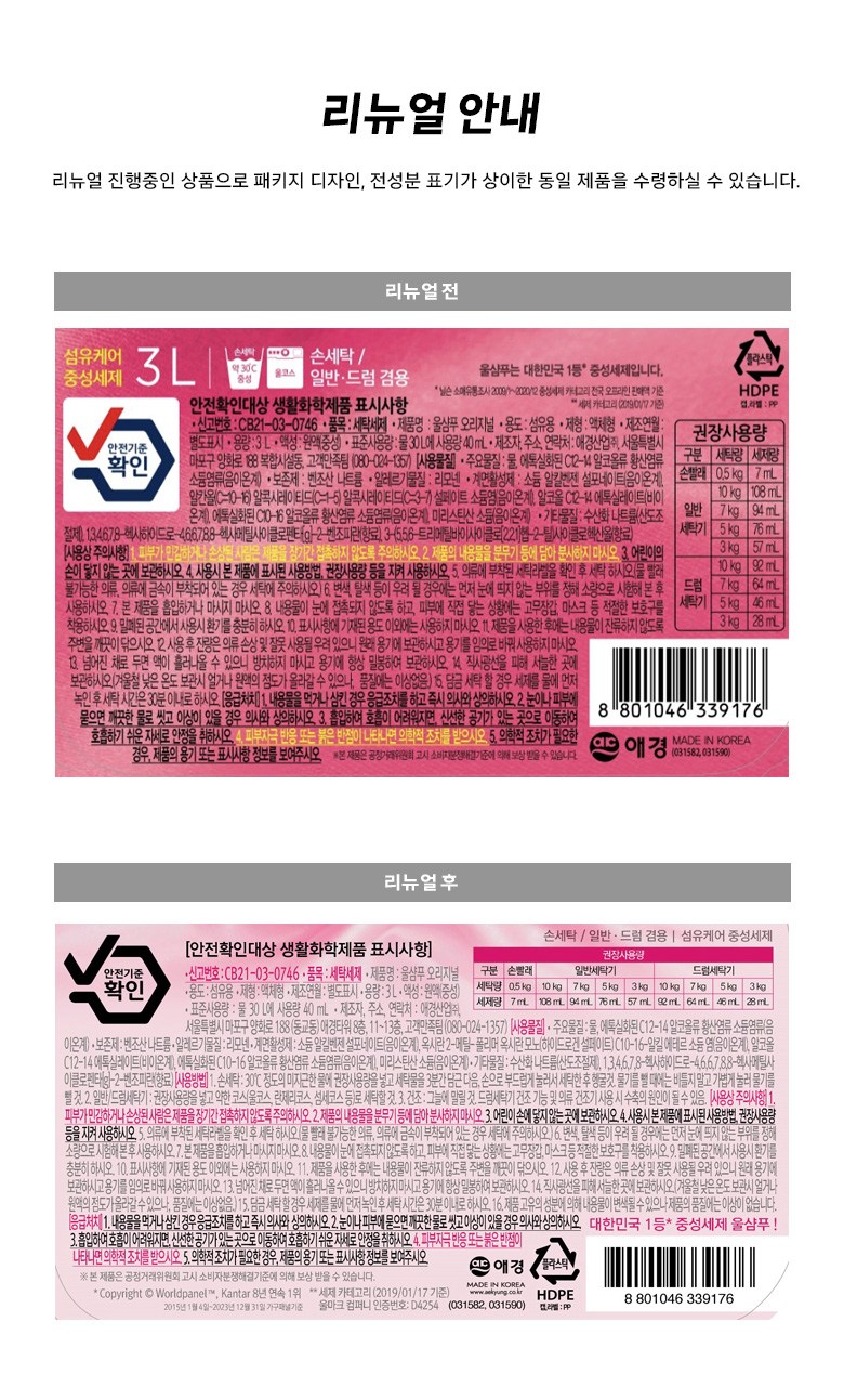 | 품목 및 제품명 | 세탁세제/울샴푸 오리지널 | 용도(표백제의 경우 계열을 함께표시) 및 제형 | 섬유용/액체형 |