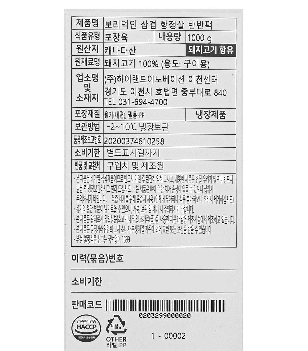 | 제조연월일, 소비기한 또는 품질유지기한 | 소비기한(또는 유통기한) : 2026년 02월 18일 이거나 그 이후인 상품 제조년월일 : 2026년 02월 10일 이후인 제조상품 | 세부 품목군별 표시사항 | 축산물 등급표시 : 해당 없음 / 이력번호 표시유무 : 이력번호 표시제품임 |