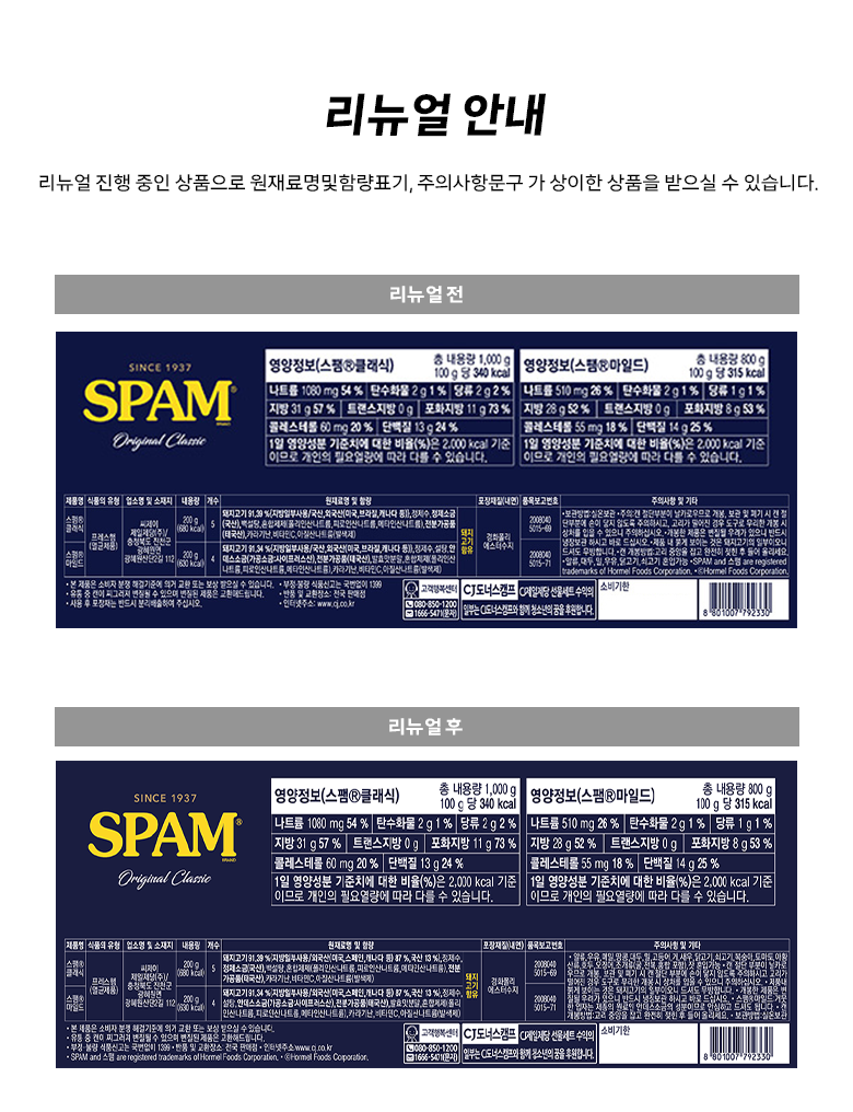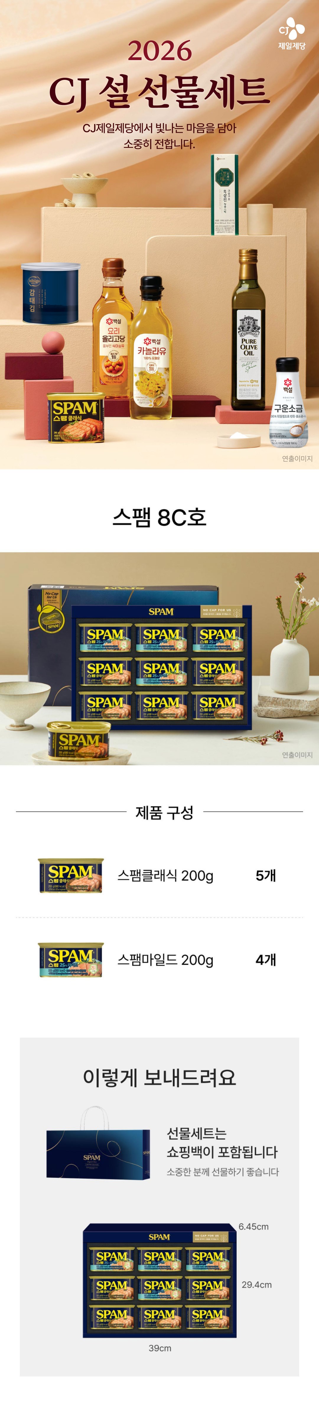 - 구성품: 스팸클래식 200g (5p) + 스팸마일드 200g(4p) + 쇼핑백