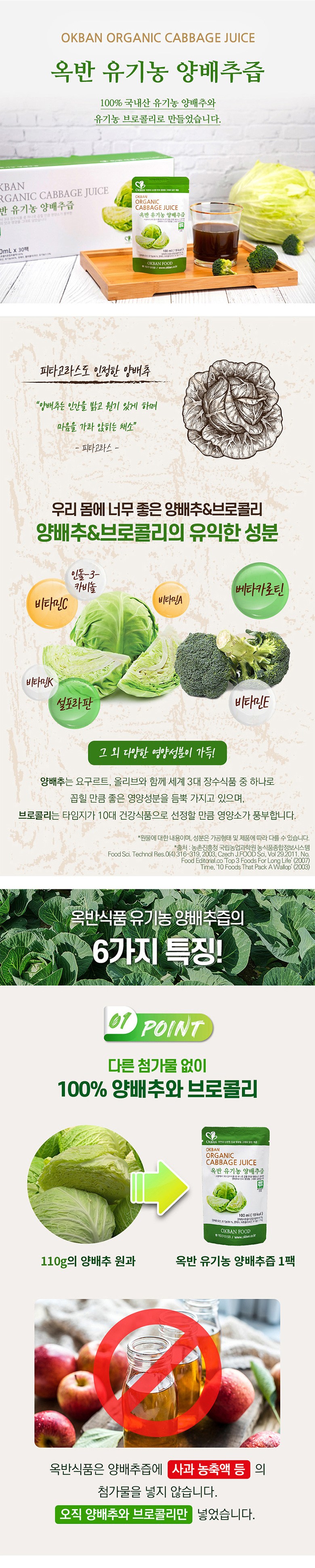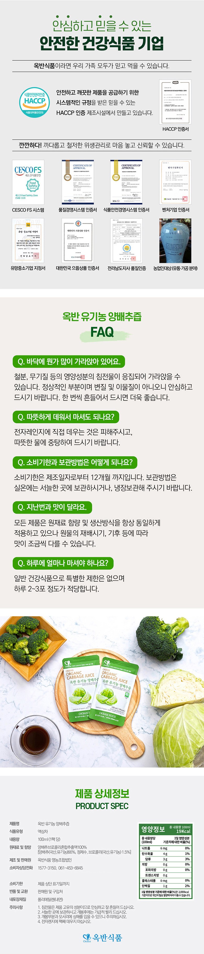 | 포장단위별 내용물의 용량(중량), 수량 | 1포 당 100ml, 60포/90포 | 원재료명 및 함량 | 유기농 양배추브로콜리혼합추출액 100%[양배추(국산, 유기농)66%, 정제수, 브로콜리(국산, 유기농)1.5%] |