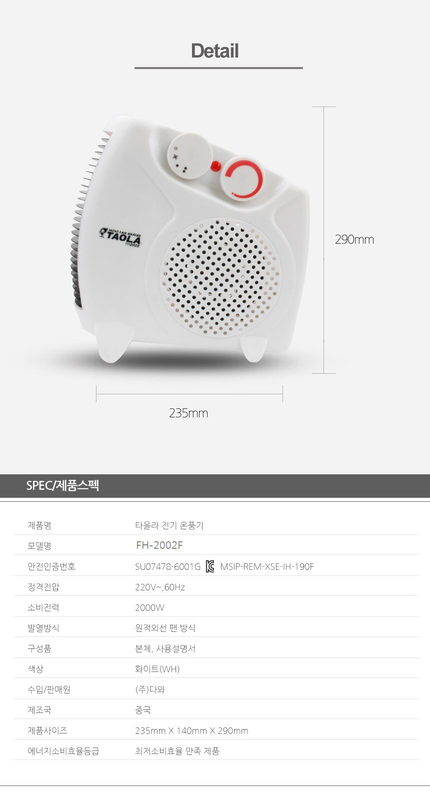 | 품명 및 모델명 | 타올라 전기 온풍기 / FH-2002 | KC 인증정보 | SU07478-6001G, MSIP-REM-XSE-IH-190F |