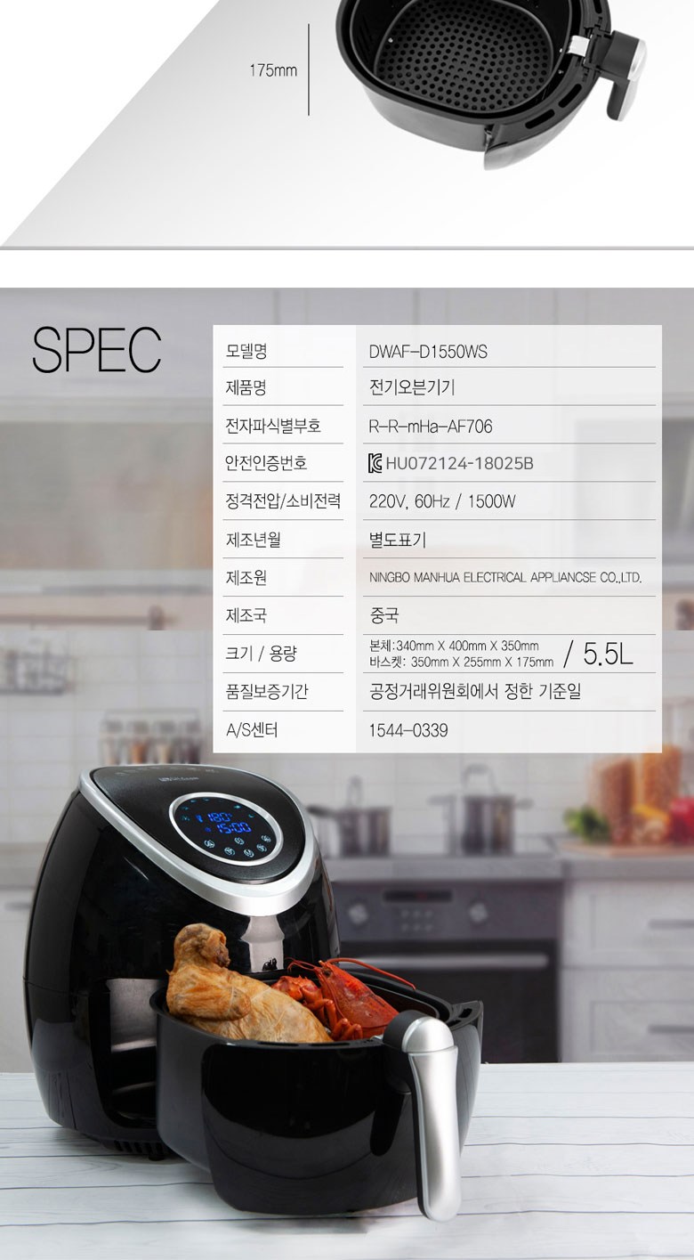 | 품명 및 모델명 | 에어프라이어 DWAF-D1550WS | KC 인증정보 | HU072124-18025B, R-R-mHa-AF706 |