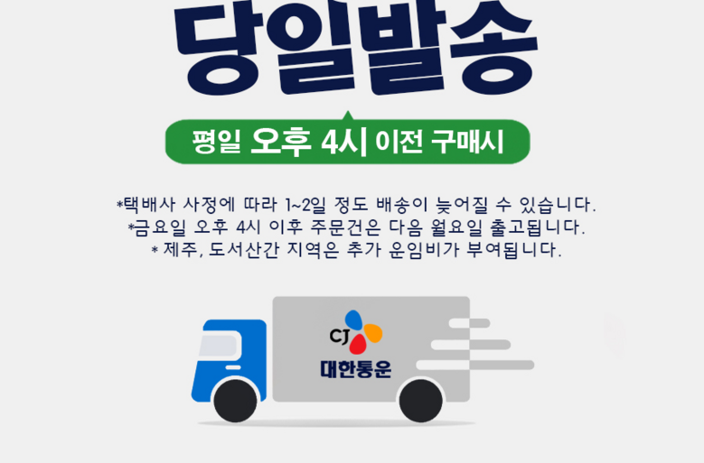 | 배송기간 | ㆍ도서산간 지역 등은 배송에 3-5일이 더 소요될 수 있습니다. - 천재지변, 물량 수급 변동 등 예외적인 사유 발생 시, 다소 지연될 수 있는 점 양해 부탁드립니다. | ||