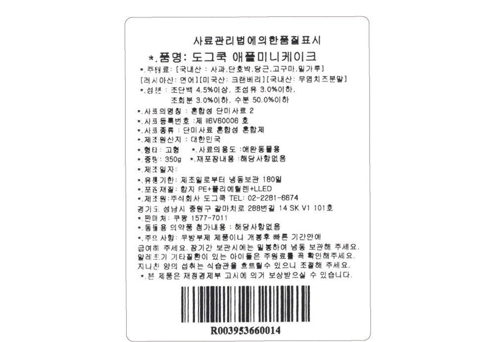 | 품명 및 모델명 | 도그쿡 애플미니케이크 | 인증/허가 사항 | 사료관리법에 따른 성분등록번호 : 컨텐츠 참조 |
